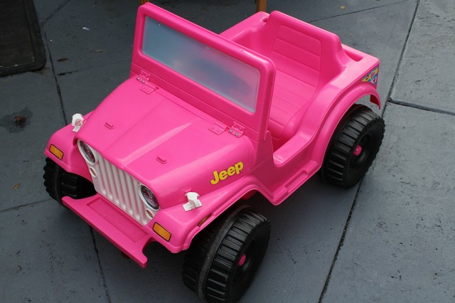 Blue jeep wrangler vs pink barbie jeep wrangler.